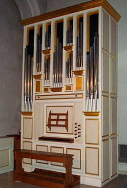 Cet instrument s’inspire en droite ligne de l’orgue italien classique, par son esthétique sonore et par son buffet peint, doré avec la façade plate en mitres, plates-faces et corniches. Comme ce type d’orgue que l’on construisait au 17ème siècle, il comprend un minimum de jeux vraiment indispensables que l’on peut grouper en deux catégories : les jeux de Ripieno (plein jeu) et les jeux Da Concerto (de concert). À première vue, cet ensemble peut paraître limité devant l’importance de bon nombre d’orgues français de l’époque, mais en réalité il est tellement cohérent et parfait qu’il se suffit à lui-même. Les facteurs d’orgues italiens le garderont à peu près intact (tout en l’aménageant un peu) jusqu’à notre siècle, contrairement à d’autres écoles dont la nôtre.